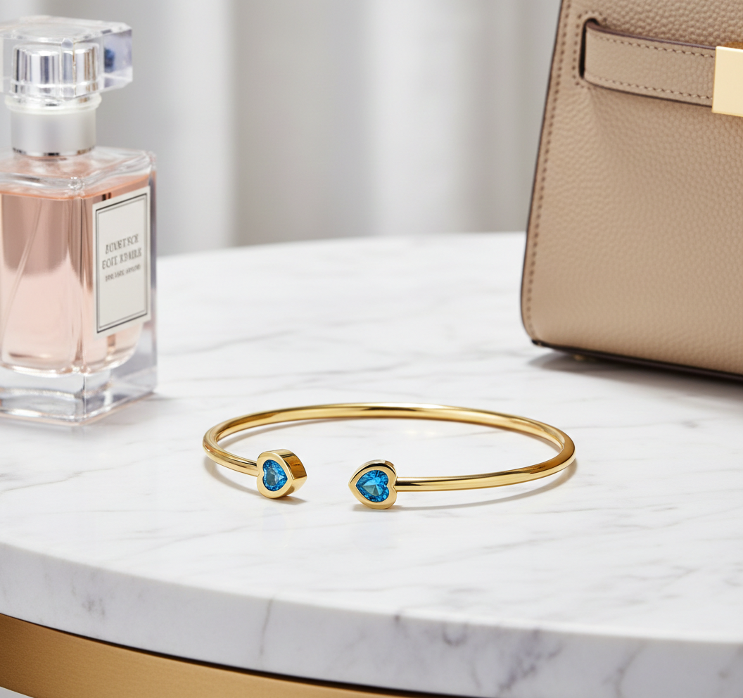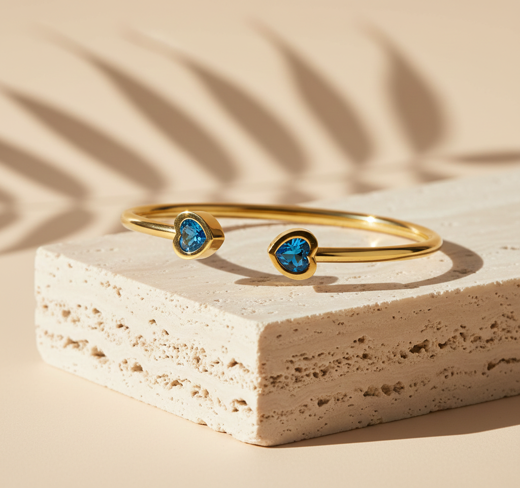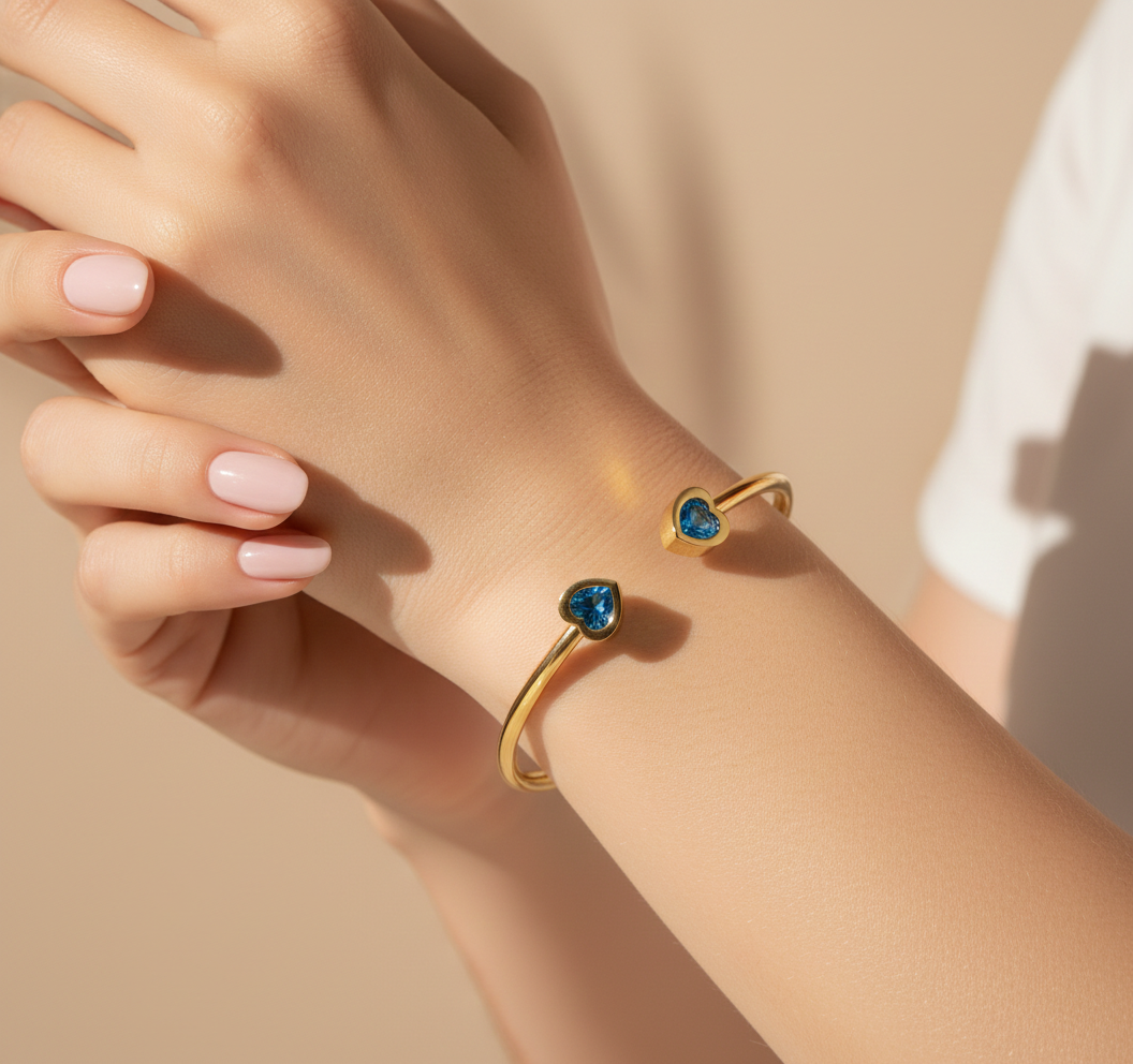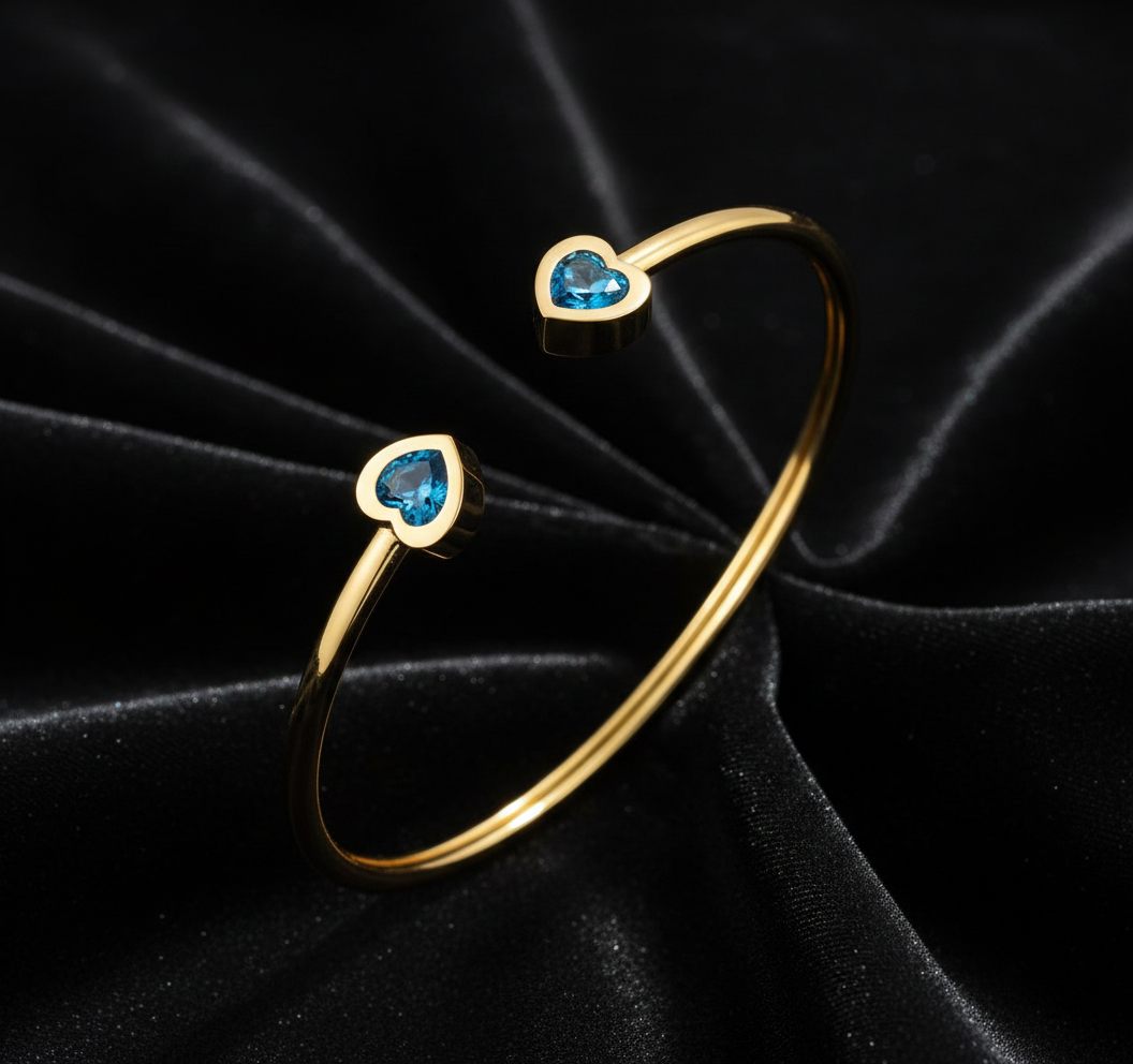 Artistic Heart Motif: The unique open-end design features two brilliant, heart-cut blue gemstones that meet in a symbolic embrace.