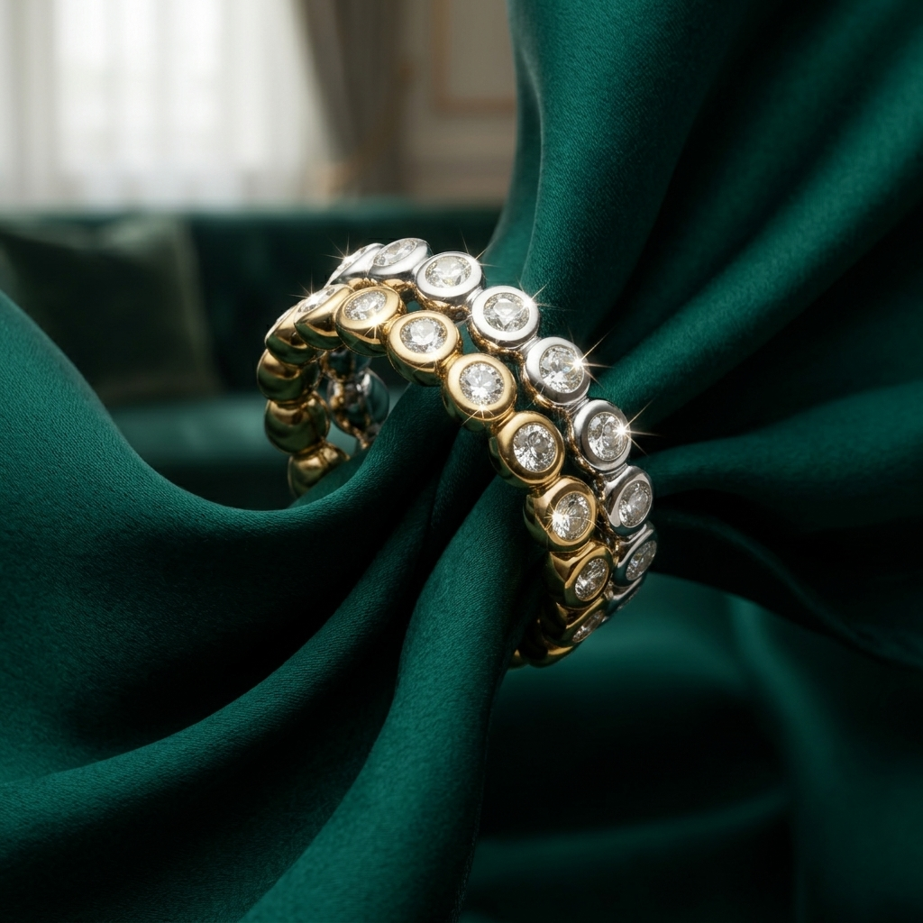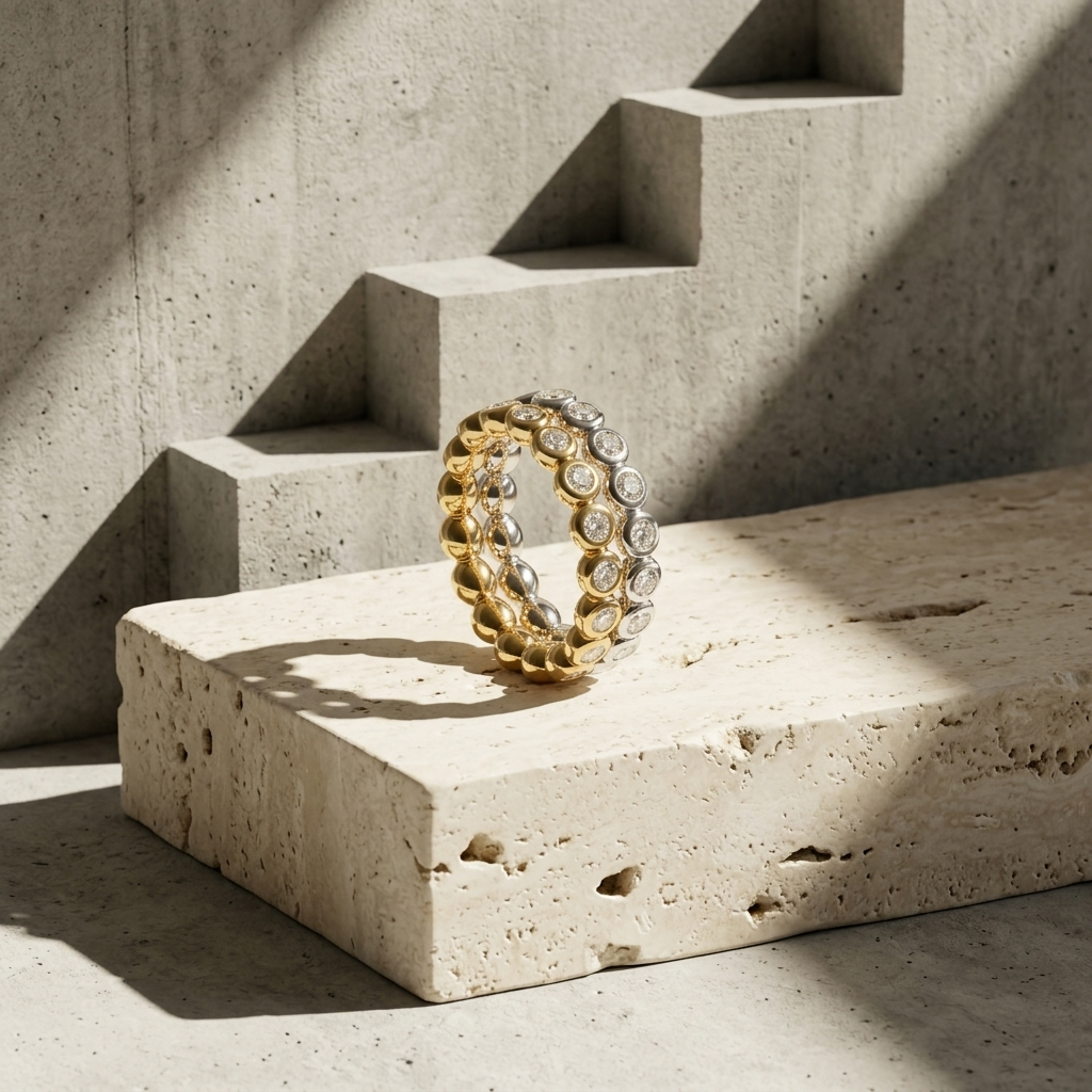 The Luminous Bezel Tier | Sculptural Two-Tone Mixed Metal & Bezel-Set Eternity Band